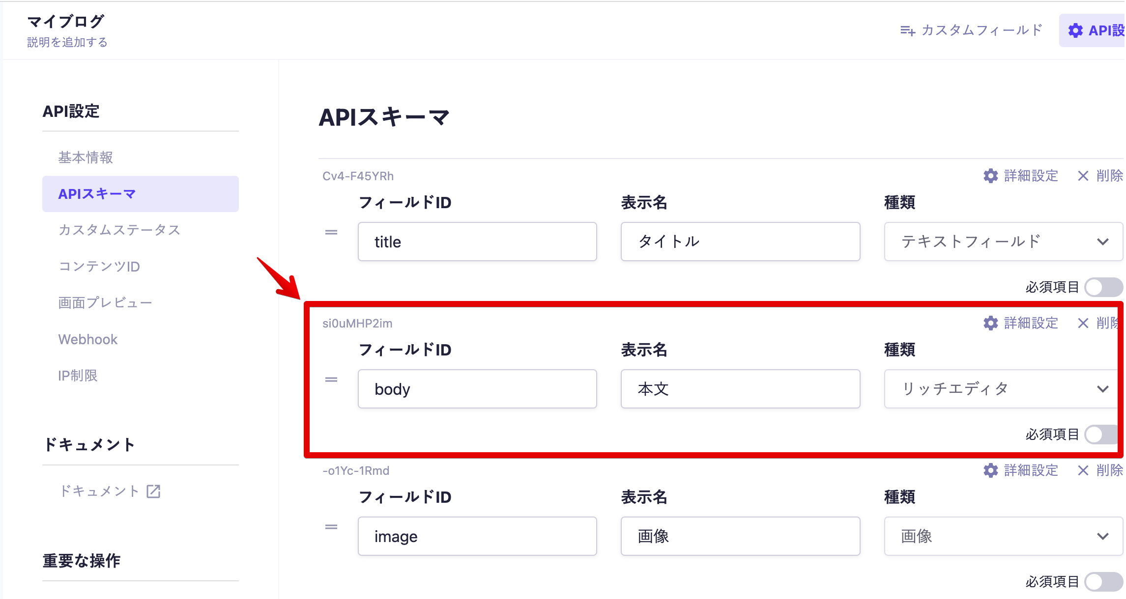 上記dataの「body」としている部分はmicroCMSでリッチエディタ部分として設定した名前を設定します。