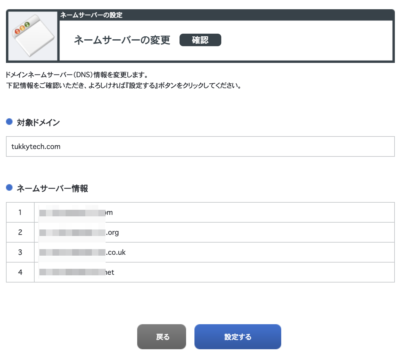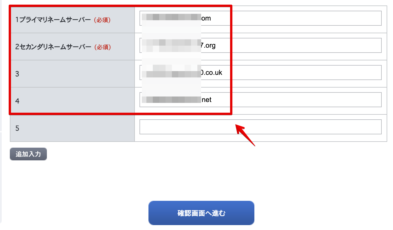 1~4のネームサーバーに、Route53で控えたNSレコードをコピペし、「確認画面へ進む」をクリックします。
