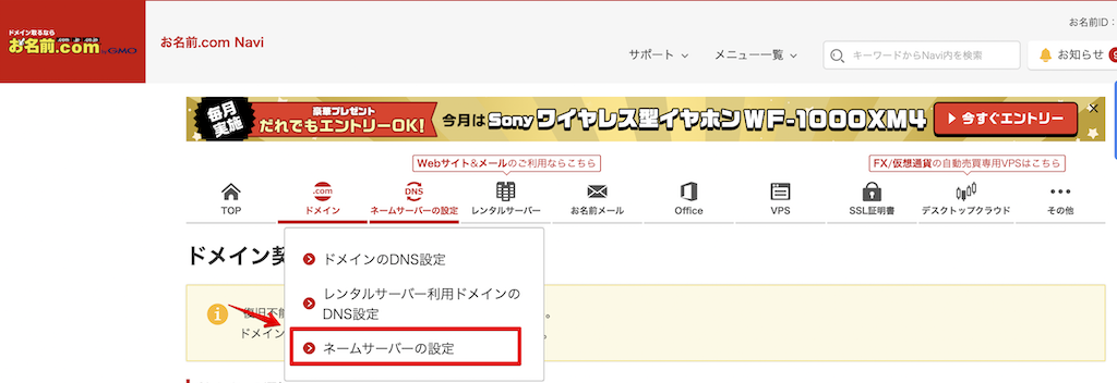 お名前.comにログインし、タブメニューから「ネームサーバーの設定」にアクセスします。