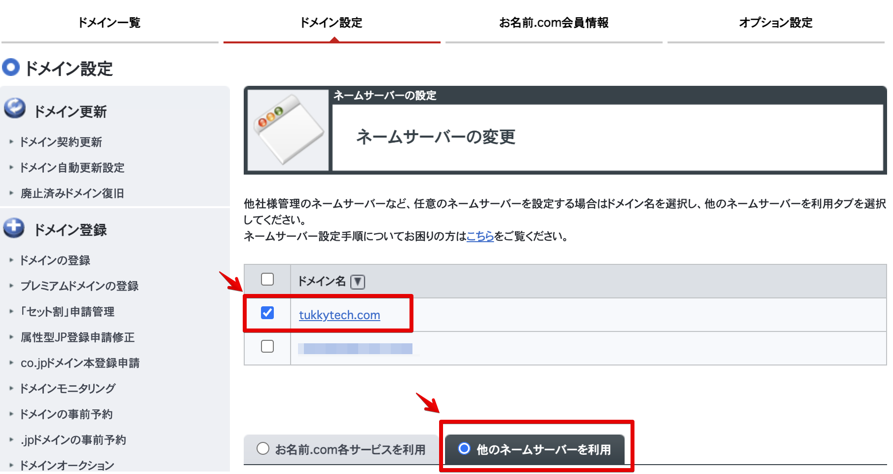 「ドメイン設定」で対象のドメインをチェックし、下部のタブで「他のネームサーバーを利用」を選択します。