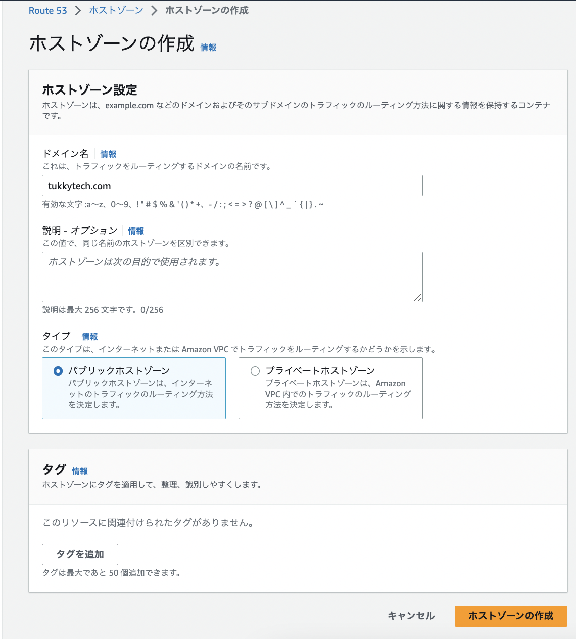 AWSにログインし、「Rout53」 > 「ホストゾーンの作成」とし、お名前.comで取得したドメインでホストゾーンを作成します。