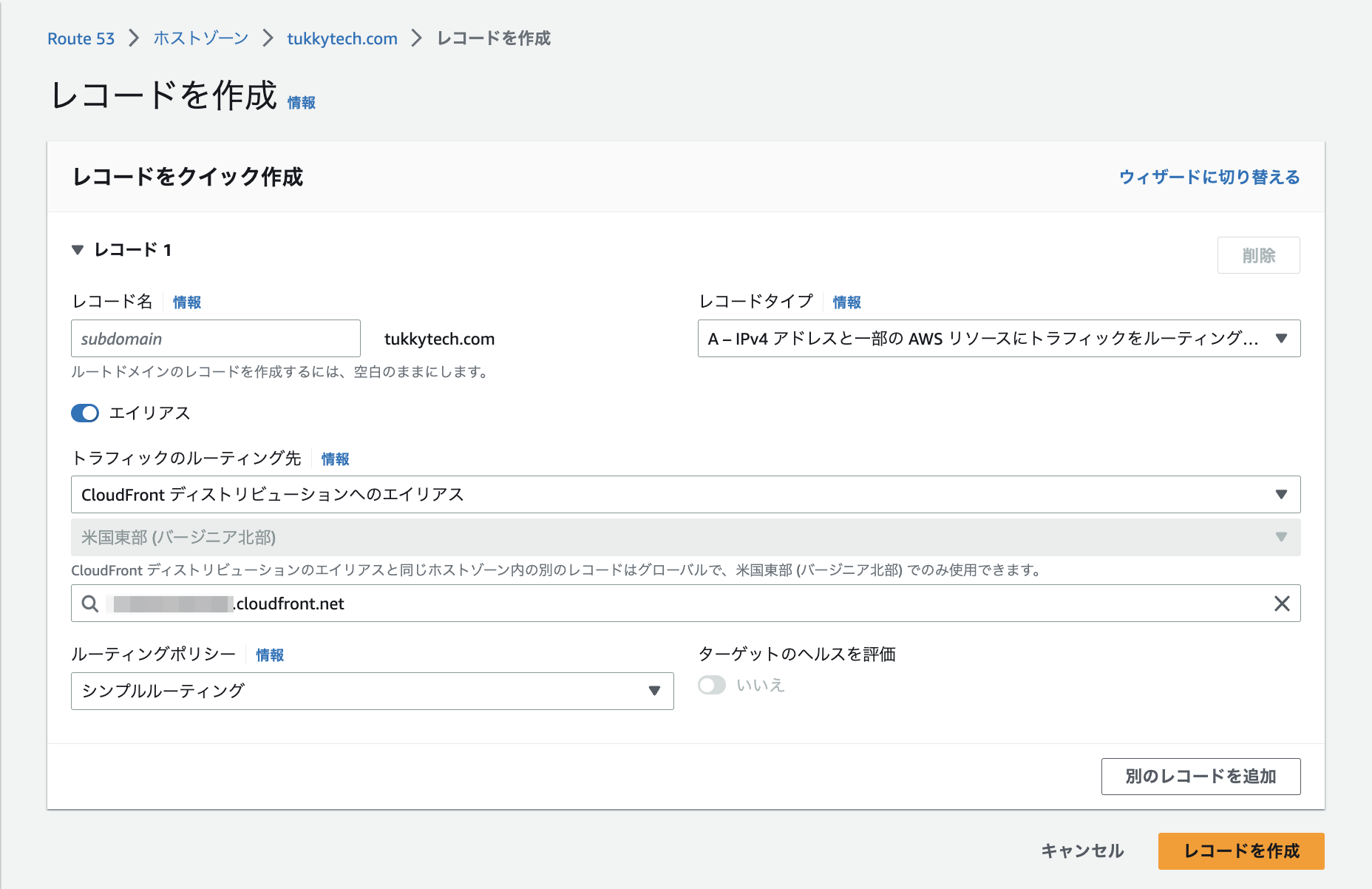 「ホストゾーン」 > 「レコードを作成」に進み、トラフィックのルーティング先を「CloudFrontディストリビューションへのエイリアス」として設定します。