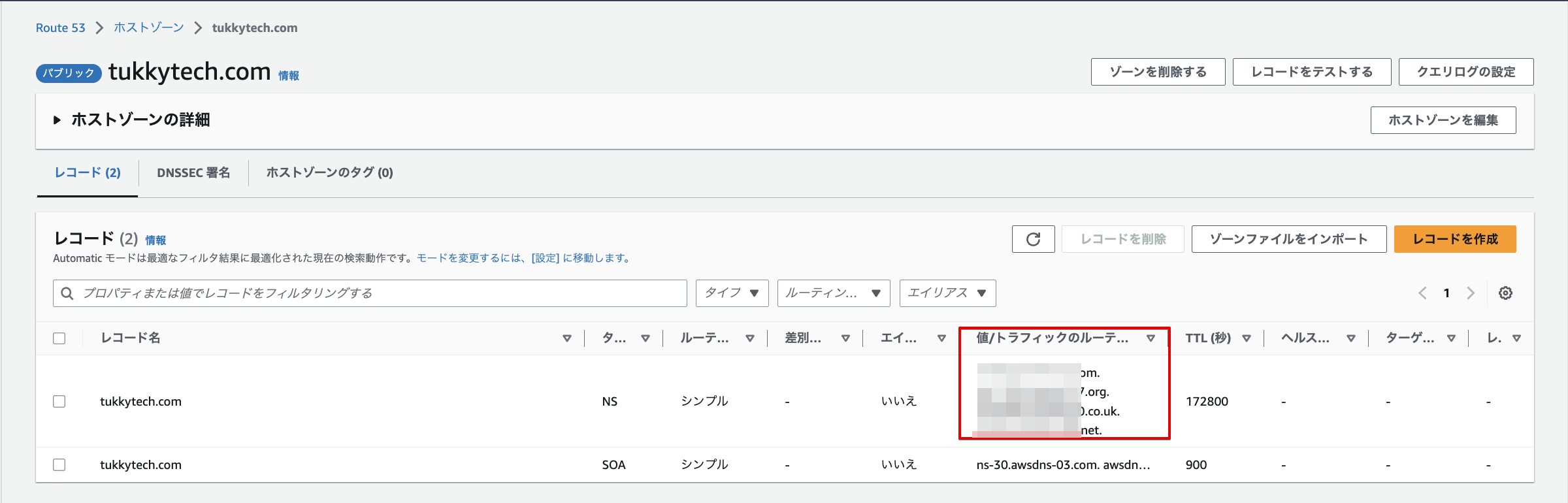 作成できたら、以下4種類のNSレコードの値を控えます。